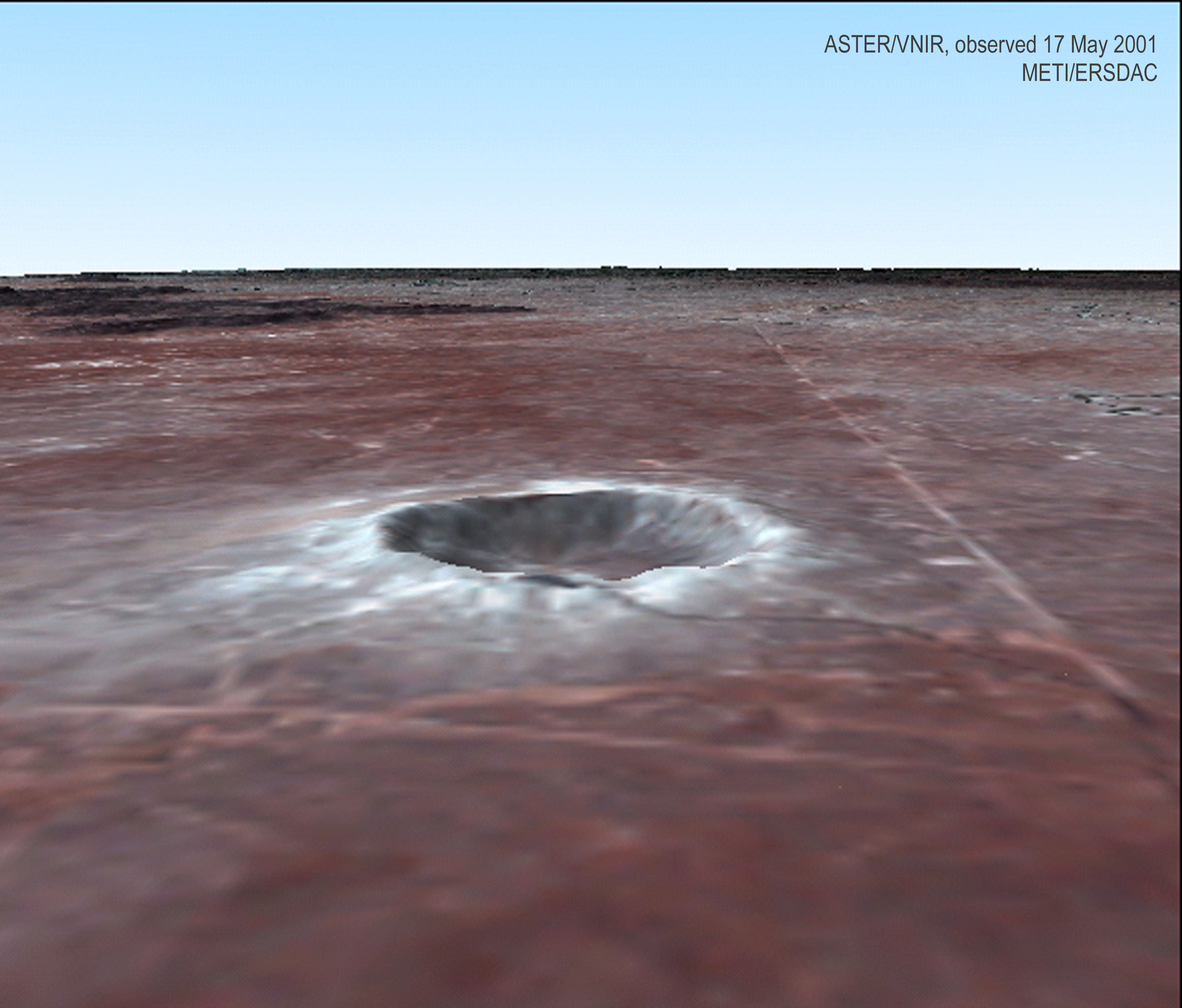 ASTERによる衛星画像は、クレータを中心に10km四方程度を切出したもので、シミュレーション・ナチュラルカラー画像です。画像が赤っぽくなっているのは、周辺の岩石や土壌が、風化による酸化で赤茶けているためです。原野にあいた大きな穴、クレータ。クレータは、宇宙から地球へ来るものがいたこと、そしてこれからもいることを物語っています。