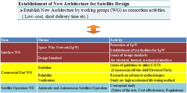 Activities to establish the new system architecture for advanced satellite systems have been performed by ASNARO consortium, which consists of large space systems manufactures, small- and medium-sized manufactures, and Japan Space Systems. Three working groups of the consortium have been researching on six themes to realize low cost, short delivery time, and automatic and autonomous operational space systems. Results of researches would be applied to advanced space systems aiming for industrialization.