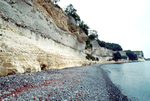 Picture - 1 The precipice of chalk Precipice in Stevns Klint in Denmark is white. Narrow seashore appears during an ebb tide. The reason that the land of chalk forms precipice all along the coast like the one in the picture is that chalk easily dissolves in water and thus susceptible to erosion. Erosion of the coastline is ongoing and it will continue in the future too. Since stones of the seashore are also chalk, they dissolve in water easily, thus keeping the size of the seashore narrow. |