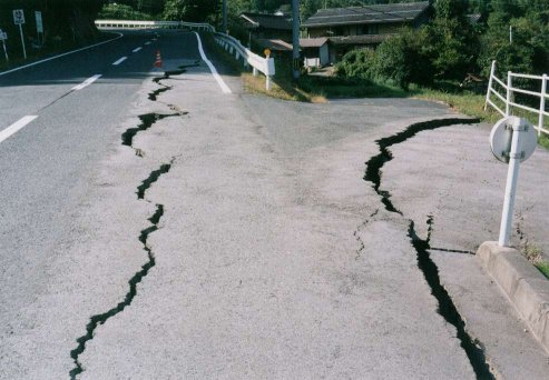 図2 地震によりひび割れした道路(平成12年鳥取県西部地震) (出典:島根大学地震災害調査団による, http://terra.riko.shimane-u.ac.jp/quake2k/index.htm) |